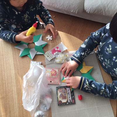 【材料】色画用紙2色×4(赤・緑などクリスマスカラーで)、好きな飾り(ボンボン、シールなど)
