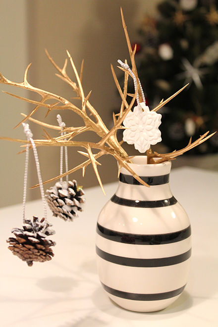 こちらの枝ツリー、節目が回るので角度が自由に変えられるし、プラスチック製なので虫の心配もありません。食卓がグッと華やかになって満足満足。