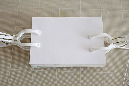 上下に切った厚紙をのせ、背表紙になる部分を綺麗に揃えて洗濯バサミで固定させます。