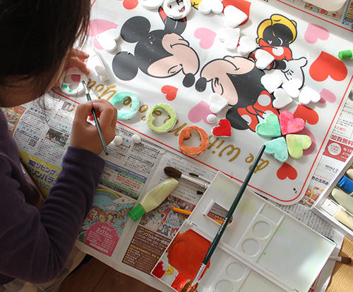 飾り付けのパーツを作成。紙粘土は型で抜いて絵の具やグリッターで色つけ。長女曰く、モールを2色使いしたところがポイントだとか。