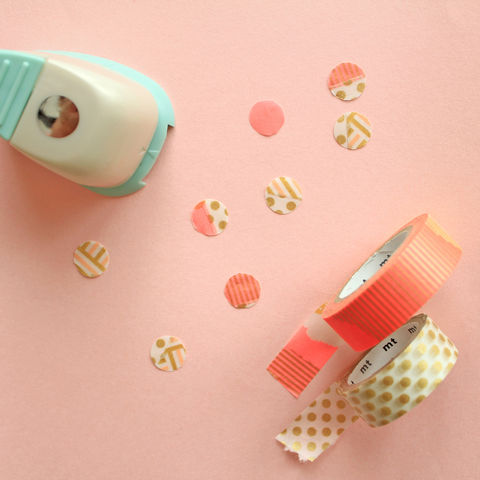 クッキングシートに柄の違うマスキングテープを横並びに隙間なく貼って、クラフトパンチで成型。