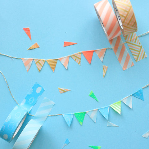 お好みのマスキングテープを適当な長さに切り(出来上がりの三角形のだいたい倍くらいの長さ)、ひもを挟むように半分に折り、三角にカット。